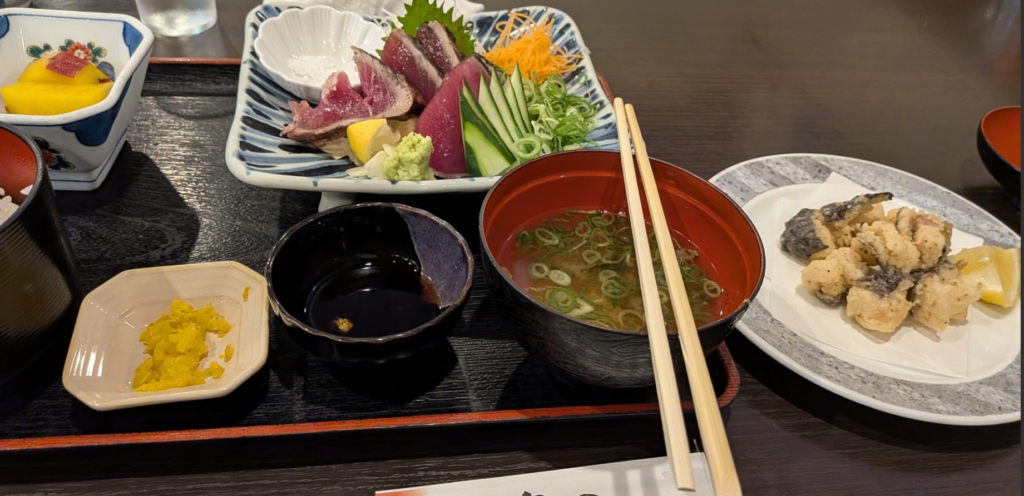 高知市内には1泊2日で訪れて一度は行ってみたかったがっかり観光地はりまや橋に向かい高知といえばカツオそれを食したかった (写真はうつぼのから揚げと本場で食べたかったカツオのたたき定食) 旅の目的はそれ がっかり観光地言い過ぎではある 実際によった所はひろめ市場